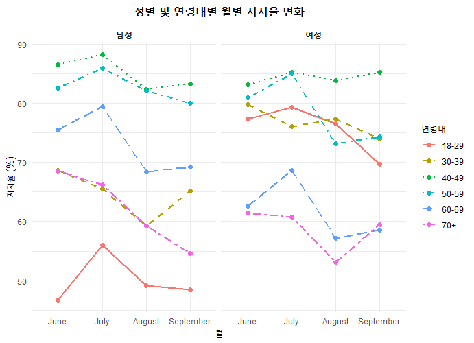 좀 더 해석하자면, 이 결과는 박근혜 탄핵이나 윤석열 탄핵에서 청년 남녀가 비슷한 태도를 보인다고 정치 성향이 비슷한게 아니라는걸 의미한다. 박근혜나 윤석열에 대한 태도는 period effects가 작용한 셈이다. 달리 말해, 박근혜 탄핵에 찬성하거나, 윤석열의 계엄에 반대하는 period effects에 기반해, 청년 남성의 보수성이라는 generation effects를 간과해서는 안된다.