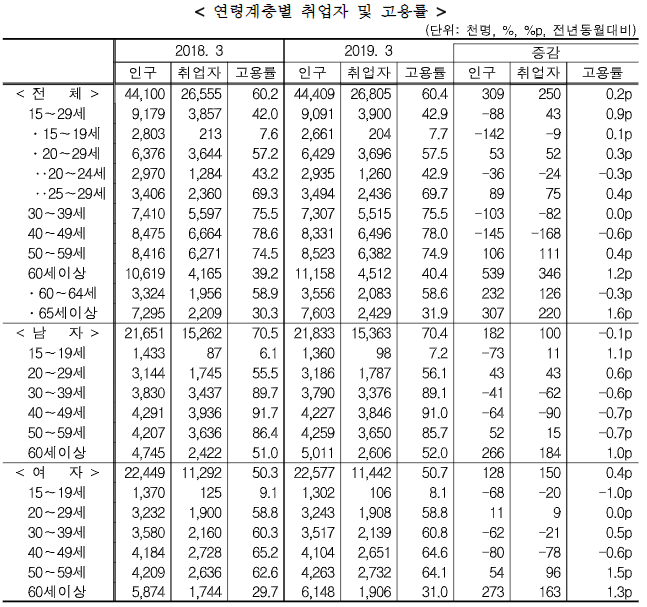 2018년 동월 대비 취업수가 25만명 늘었고, 고용률은 3월 기준 역대 최고. 실업률은 0.2%포인트 하락.