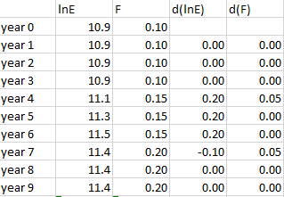 그런데 이 상황에서 김낙년 교수처럼 종속변수를 고용(=lnE)이 아니라 고용의 변화 (=d(lnE))로 바꾸고, d(lnE)와 F의 관계를 보면 부정적 상관을 보이게 됨. 상관관계 값이 -.13. 최저임금이 고용에 부정적 영향을 끼친다는 황당한 결론을 내리게 됨.