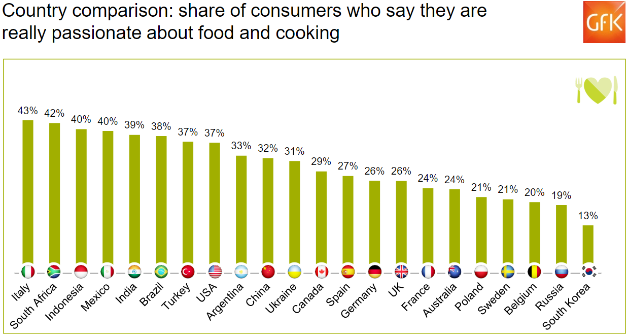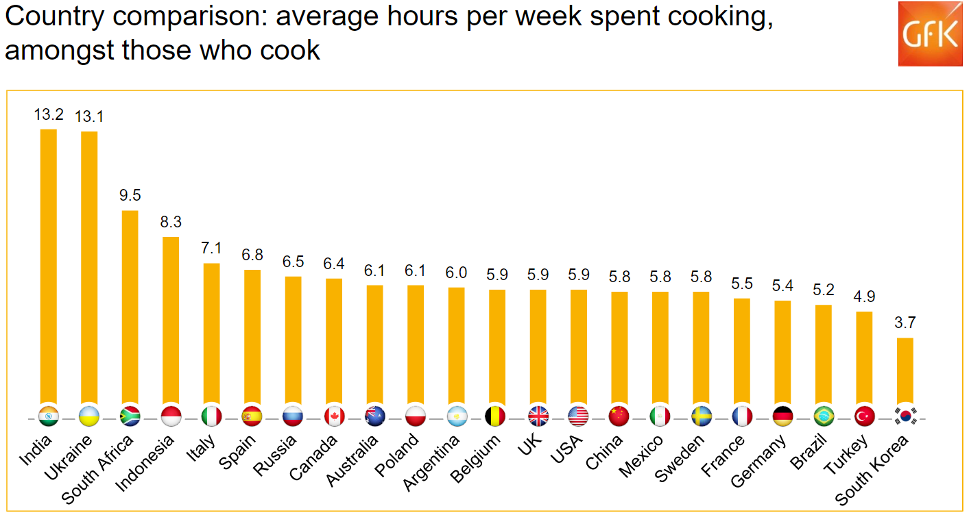 GfK라는 컨설팅 회사에서 2015년에 음식 관련 국제 서베이를 한 적이 있음. 이 서베이에서 요리에 대해서 얼마나 관심이 있는지 몇 시간이나 요리하는지 물어봄. 그 결과가 아래와 같음.