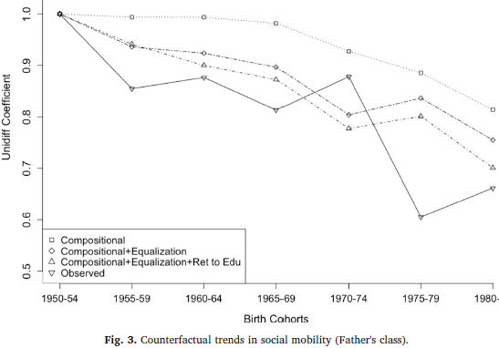 부모 계급과 자녀의 계급 상관성은 두 가지로 요소분해할 수 있음. 하나는 구조적 요인 (structural mobility), 다른 하나는 순수한 사회 이동 (fluidity 또는 relative mobility 또는 circulation mobility).