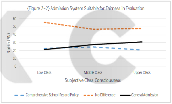 그렇다면 평가의 공정성에 대한 인식도 계층에 따라 달라질까? 아래 <Figure 2-2>에서 보듯 계층이 높아질수록 정시가 더 공정하다고 생각함. 하층에서는 정시와 수시의 차이가 없음.