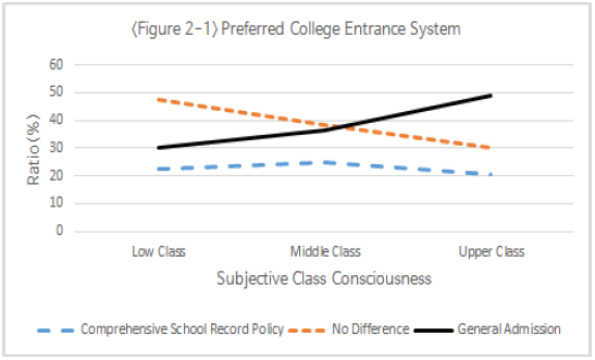 계층 지위가 높을수록 수시보다는 정시를 선호하고, 정시가 더 평가의 공정성이 높다고 생각하고, 정시가 더 기회평등을 제공한다고 생각.