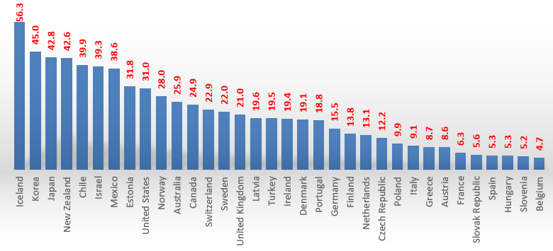 한국은 보다시피 60대 후반 고용률이 45%로 노인 고용률이 가장 높은 국가 중 하나. OECD 국가 중 노인고용률이 두 번째로 낮은 벨기에는 4.7% (가장 낮은 룩셈부르크는 거의 0%). 한국의 10분의 1에 불과. 프랑스도 노인고용률이 6.3%.