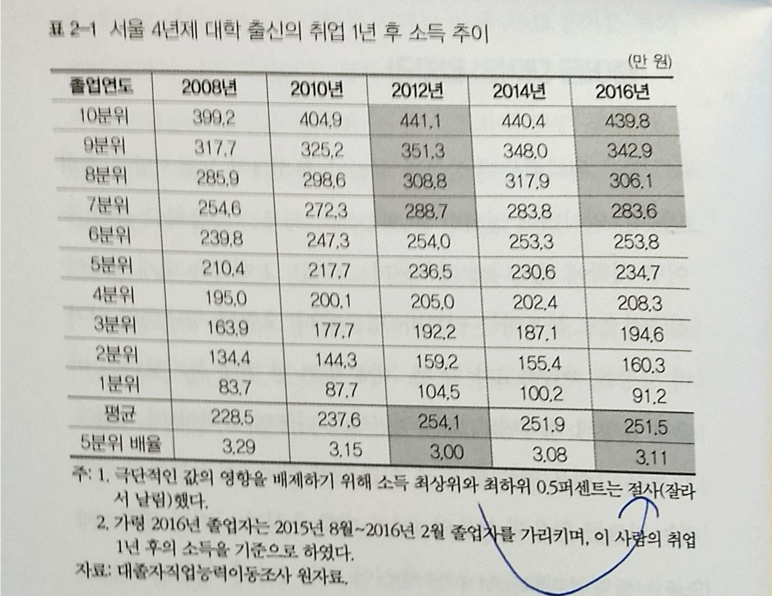 300만원 이상 소득이 중산층 진입의 문이라면, 이 문은 지방대와 2년제 출신자에게 과거보다 더 넓어졌다. 중산층보다 하위계층에서 지방대와 2년제 진학을 더 많이 할테니, 중산층 진입의 문은 90년대생으로 넘어가면서 소득하층 출신에게 더 넓어진 것이다. 그러데 저자는 서울4년제 대학에만 초점을 맞춰서 대졸 후 괜찮은 일자리를 얻기가 힘들어져 중산층 진입의 문이 좁아졌다고 주장한다.