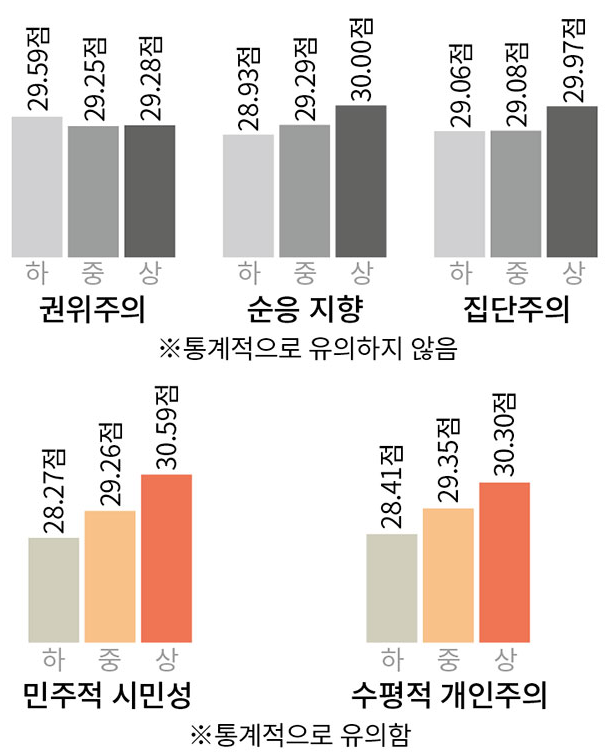 아래 그래프는 기사에 나온건데 "외출시 마스크 착용" 등 10여개 방역 행동 문항에 1(전혀 안한다)~4(항상 한다)의 점수를 부여하여 총 10~40점이 나오도록 계산한 결과를 보여준다. 회색 빛 그래프인 권위주의, 순응지향, 집단주의는 상-중-하 그룹 간에 통계적으로 유의한 차이가 없다. 반면 민주적 시민성이 높아질수록, 수평적 개인주의가 높아질수록 방역에 더 참여하고 통계적 차이도 유의하다.