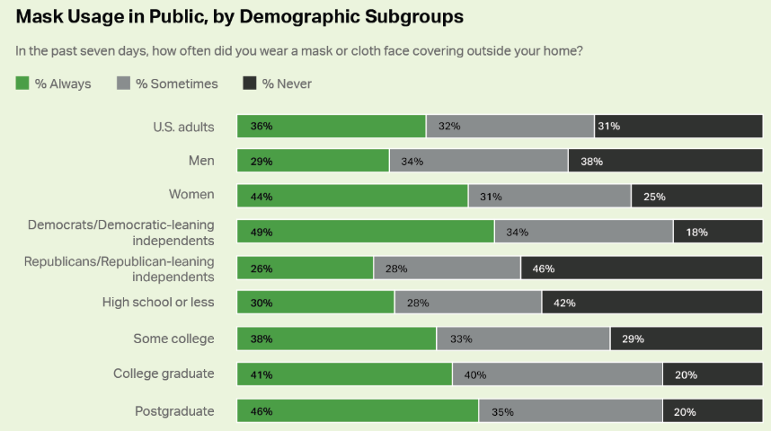 보다시피 공화당 지지자는 26%만 항상 마스크를 쓰는데, 민주당 지지자는 49%가 항상 쓴다. 남녀 간에도 큰 격차가 있고 학력별로도 많이 다르다. 한국인의 특징인 동질성과는 매우 달리 집단별 이질성이 특징이다.