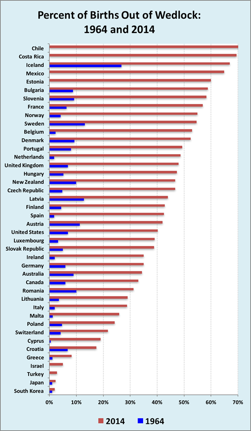 아래 그래프는 1964년과 2014년의 전체 출산 중 혼외출생의 비율이다. 보다시피 1964년에는 전체 출산 중 혼외출산이 차지하는 비중이 거의 모든 국가에서 낮았는데, 지금은 대부분의 선진국에서 절반 이상의 출산이 혼외 출산이다.