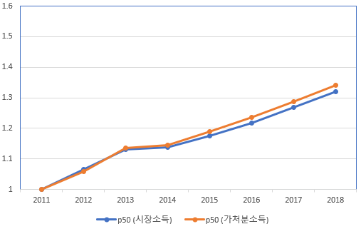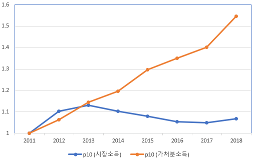 보다시피 중간층(=p50)과 소득상층(=p90)은 시장소득의 변화와 가처분소득이 비슷하게 변화했는데, 소득하층(=p10)은 시장소득은 증가하지 않았지만, 가처분소득은 중간층이나 소득상층보다 더 빠르게 증가하였다.