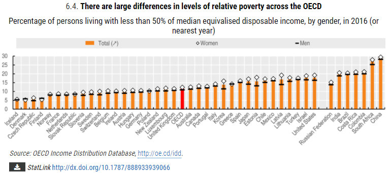 그렇다면 다른 국가와 비교하면 어떨까? 위에서 제시한 통계가 국가 공식 빈곤율과는 얼마나 차이가 날까? 위 보고서에는 언급하지 않았지만 이 질문을 하지 않을 수 없다. 아래 그래프는 가구균등화 중위소득 50% 이하로 빈곤을 파악한 OECD 통계다 (그래프 원소스는 요기).