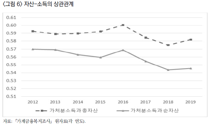 아래 그래프는 이성균 외 (2020, 경제와사회)에 실린 자산과 소득의 상관관계. 보다시피 점점 양자의 상관관계가 최근 줄어들었다. 고소득층이 반드시 고자산가는 아니고, 자산 상층이 고소득층이 아니다. 주원인은 고연령층이 늘어나고, 이들이 자산은 많지만 가처분소득은 줄어드는 상황이기 때문.