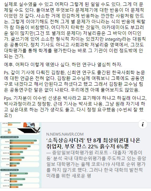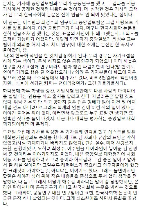 왜 기사의 근거가 된 논문을 밝히고, 기사를 위해 추가 분석을 요청했다고 사실대로 밝히지 않는 것인가? 왜 마치 중앙에서 기획하고 최성수-김창환 팀에서 분석 자료만 제공했다는 식으로 기사를 쓰는가? 사실대로 얘기하고 특집을 만들어도 충분히 좋은 기사고 충분히 높은 기획력인데 왜 이렇게 하지 않는가?