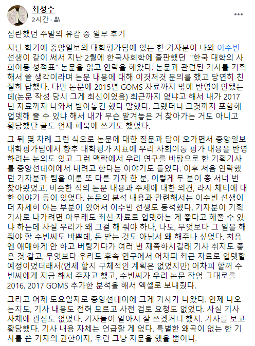 아래 최성수 교수의 허락을 받고 페북글을 공유한다. 한 번 읽어 보시길. 언론에서 이래도 되는건지. 이러는게 관행이라니.