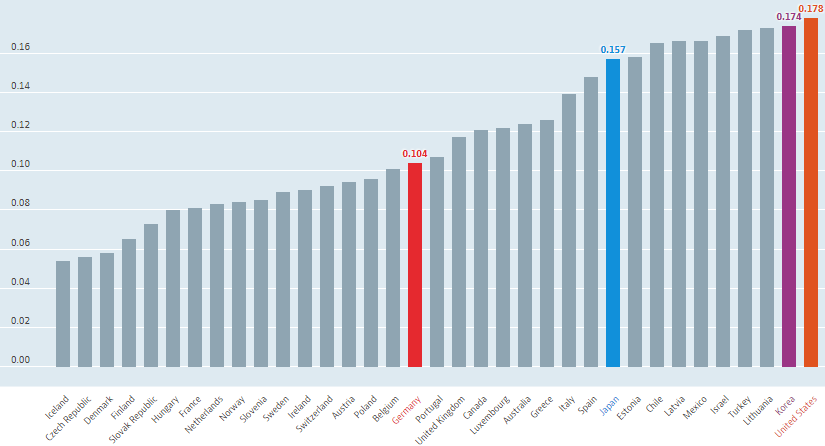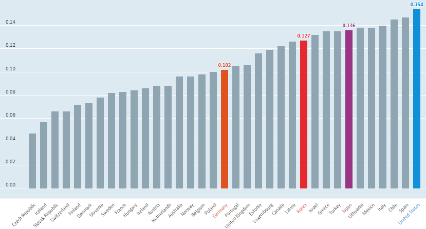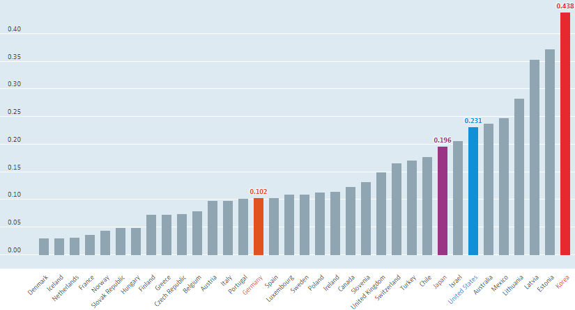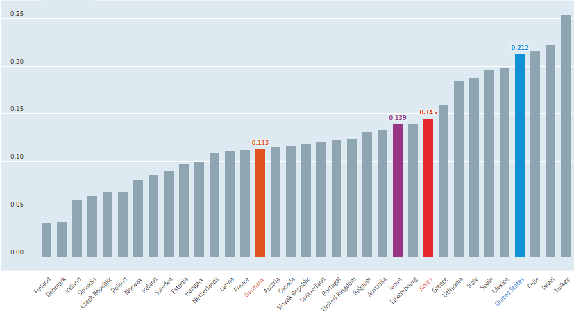 국제 비교에서 보편적으로 쓰이는 빈곤의 기준은 균등화 중위소득의 50% 이하의 가구소득이다. 이 기준으로 OECD 국가 중에서 한국은 두 번째로 빈곤율(17.4%)이 높다. 첫째가 미국 (17.8%)이다. 일본은 15.7%고, 독일은 10.4%. 북구 복지국가는 모두 10% 미만이다. 한국은 OECD 국가 중 빈곤 문제가 가장 심각한 나라 중 하나다 (데이터 소스는 요기).