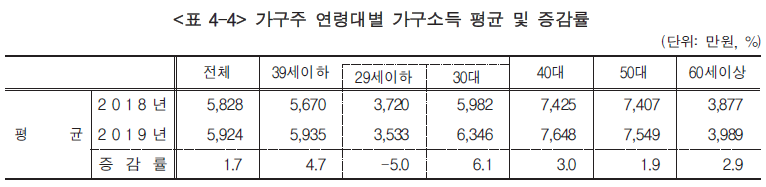 아래 표에서 보다시피, 가구주 연령 기준으로 30대의 2018년대비 2019년 소득 증가율이 가장 높다. 50대가 가장 낮고. 86세대가 경제 패권을 장악했다는 주장과는 거리가 많이 먼 결과.