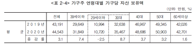 그럼 자산의 측면에서는 세대불평등이 증가하였을까? 결과는 아래와 같다. 자산보유 절대액이 낮은 30대의 증가율이 가장 높고, 나이가 올라갈수록 증가율이 낮아진다. 이게 장기적 경향인지는 확신할 수 없지만, 2018-19년 사이에 자산 측면에서 세대 간 불평등이 줄어들었다고 보는게 타당하다.