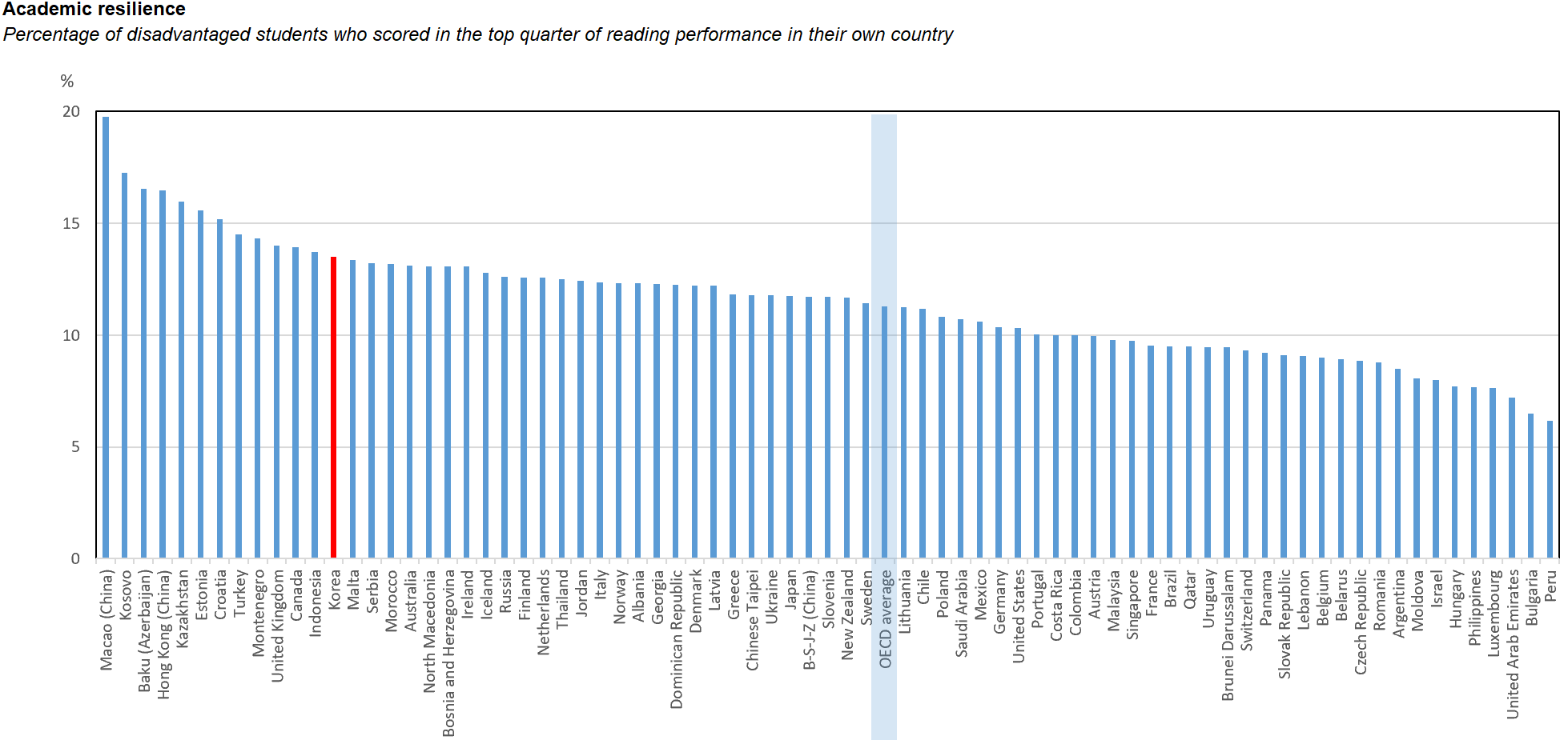 아래 그래프는 각 국가별로 저소득층(하위 25%)에서 상위권 성적을 거두는 학생들의 국가별 비율이다 (자료 소스는 요기). 2018년 PISA를 분석한 가장 최근 자료다. 보다시피 한국은 개천에서 용나는 비율이 상당히 높은 국가 중 하나다. 교육의 천국이라고 생각하는 핀란드 보다 높고, 얼마 전 논쟁이 되었던 독일보다도 크게 높다.