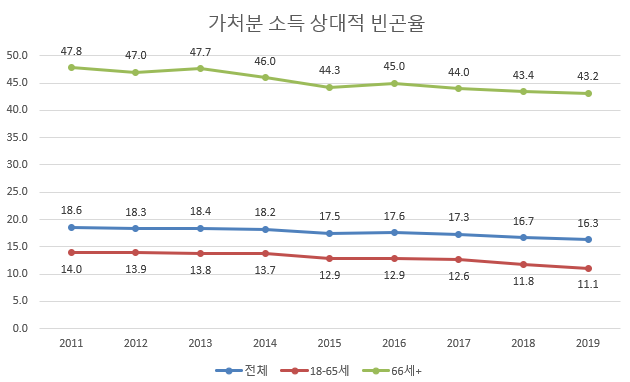 아래 그래프가 2011년 이후 전체 인구, 18-65세, 그리고 66세 이상의 상대적 빈곤율 변화이다 (원자료 소스는 요기 + 올해 가금복 발표 내용). 보다시피 한국의 상대적 빈곤율은 최근 꾸준히 줄어들었다. 2009,10년 정도에 최고점을 찍고 그 이후는 줄어드는 추세다.