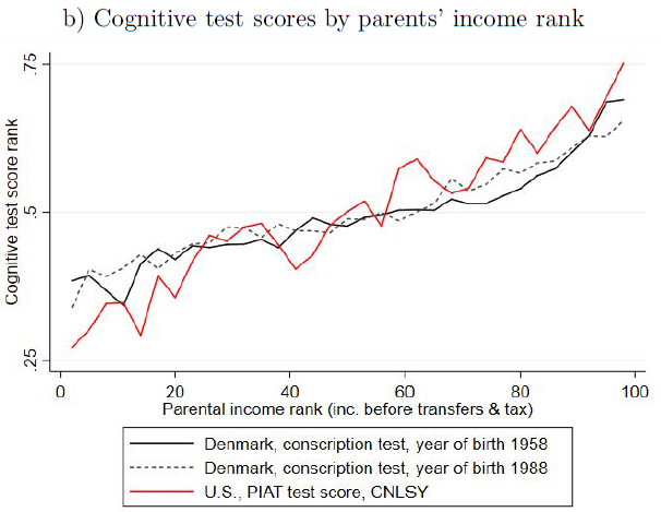교육 효과에 대해 조금 더 자세히 살펴보자. 아래 그래프는 부모의 소득 수준에 따라 자녀의 학업성적이다. 덴마크의 1958년생이나, 1988년생이나 차이가 없고, 미국이나 덴마크나 차이가 없다. 금수저의 자녀가 흙수저의 자녀보다 성적이 높다.