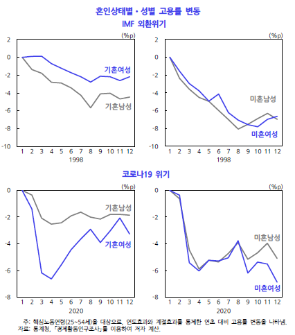 2020년 후반기에 미혼자의 성별 격차가 커진 이유는 좀 더 분석을 필요로 한다. 코로나 블루 때문인지, 아니면 하반기 경제 상황이 미혼 여성에게 더 불리한 뭔가가 있었던건지.