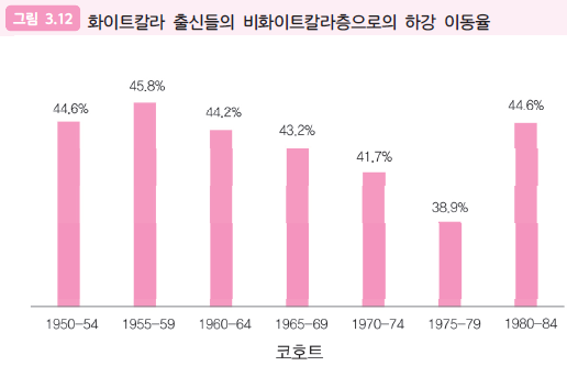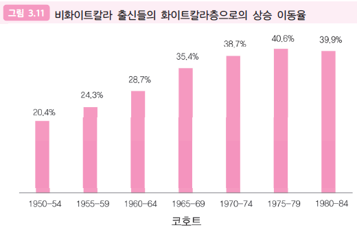 그런데 출신 계급별로 나누어서 보면 그 내용이 사뭇 다르다. 부모가 비화이트칼라인 계층은 자녀가 화이트칼라로 상승 이동하는 확률이 최근까지 계속 높아졌다. 80년대 출생자가 그 전 연도 출생자보다 상승이동률 증가가 주춤하지만 여전히 과거보다 높은 상승 이동률을 기록 중이다.