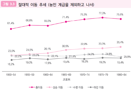 출생 코호트별로 농민을 제외하고 부모의 출신 계급에 따른 자녀 세대의 계급을 보면 아래 그림 3.3와 같이 자녀가 부모보다 계급 지위가 높아지는 확률이 계속 높아졌다. 상대적 이동 뿐만 아니라 절대적 이동에서도 계층사다리가 무너졌다고 할 수 없다.