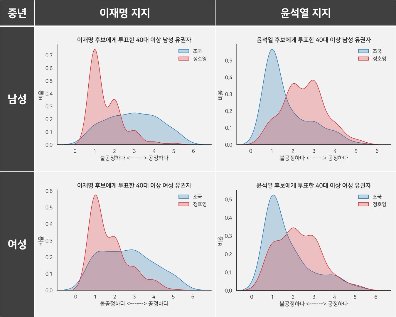 아래 그래프에서 보이는 40대 이상의 응답경향이 일반적이다. 정치성향에 따라 대상만 바뀔 뿐 판단의 경향에 차이가 없다. 성별 격차도 거의 없고. (그래프는 강태영 대표 소셜미디어에서 베껴왔다.)