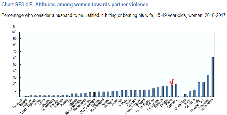 부인이 음식을 태웠거나, 남편에게 대들었거나, 말도 안하고 외출했거나, 애들을 돌보지 않았거나, 성관계를 거부했을 때는 남편의 폭력이 정당화될 수 있다고 대답한 비율. 18.4%