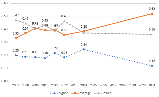 보다시피 자신들의 소득이 한국 평균이라는 대답이 2007년 33%에서 2021년 52%로 대폭 늘었다. 19%포인트, 증가율로 보면 근 60%에 달한다. 이에 반해 하층이라는 응답은 47%에서 36%로 11%포인트 줄었다. 상층이라는 응답도 20%에서 12%로 줄었다. 2007-8년에는 하층이라는 응답이 중산층보다 15%포인트 많았는데, 이제는 중산층이라는 응답이 하층이라는 응답보다 16%포인트 더 많다. 객관적 지표에서만 중산층이 늘어난게 아니고, 주관적 인식에서도 중산층이 늘었다.