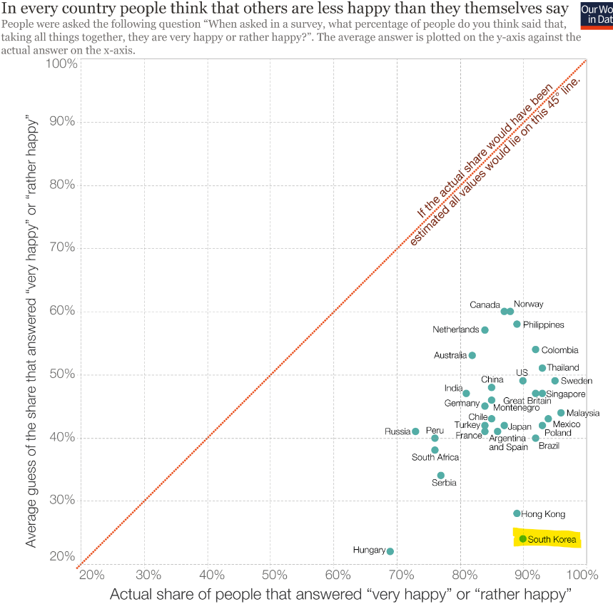 그런데 한국인의 행복관련 응답 중 가장 큰 특징은 나는 행복한데, 남은 불행하다고 답하는거다. 아래 그래프(출처는 요기)는 World Value Survey (WVS) 에서 현재 행복하다고 응답한 비중과 Ipsos 조사에서 남들은 얼마나 행복하다고 생각하는지 물어서 행복할거라고 응답한 비율을 대비한 것이다.