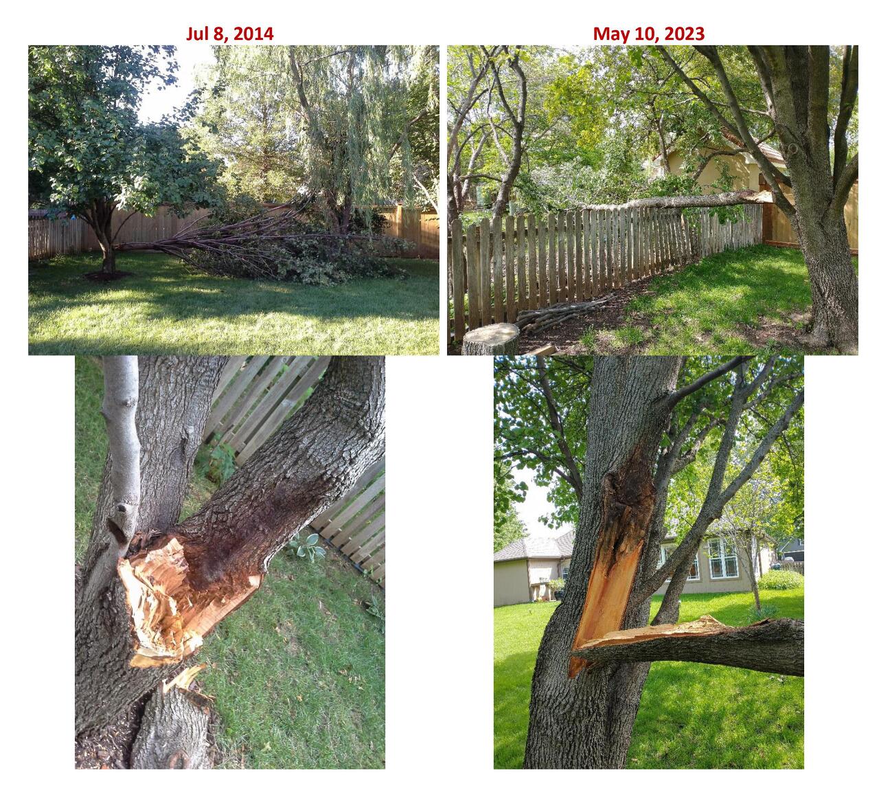 9년 전 뒷마당 나무에 벼락 맞아서 큰 가지가 쓰러졌었는데, 오늘 같은 나무가 두 번째 벼락을 맞았다. 다르다면 큰 가지가 쓰러진 방향이 반대라는 것.