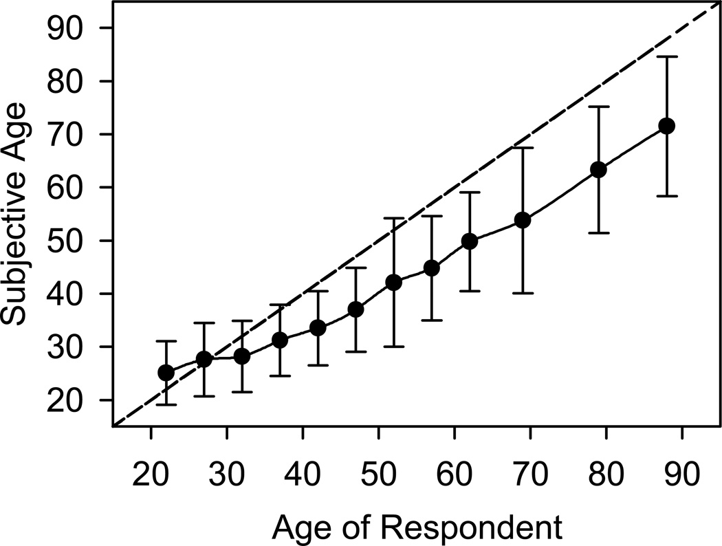 Rubin & Berntsen 연구의 아래 그래프를 보면 실제 나이와 주관적 나이의 절대값 격차는 나이가 들수록 커진다. 그러니 40세 이상에서는 새해에 주관적으로는 나이를 한 살 더 먹는게 아니라, 0.8살 더 먹는거다.