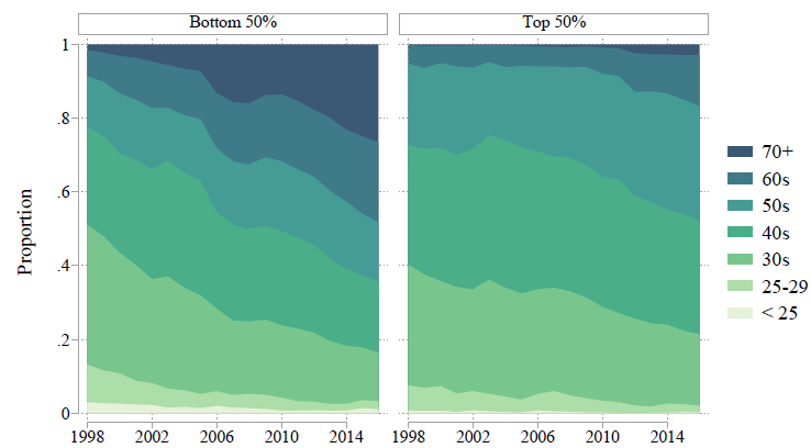 이에 반해, 20-30대 청년 가구층은 인구 감소로 소득 상하위 모두에서 그 비중이 줄어들지만, 하위50%에서 더 크게 줄어든다. 과거에는 하위가구의 절반이 20-30대였는데, 지금은 18% 정도 밖에 안되고, 상위가구에서는 과거에는 40%였는데, 지금은 22%다. 가구 랭킹으로 봤을 때, 청년층 가구의 상대적 소득은 개선되었다.