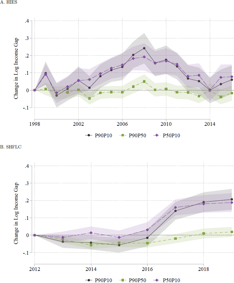 이 블로그에서 몇 번 얘기했지만(예를 들면 요기, 요기), 한국의 불평등은 상위불평등의 변화가 아니라 하위불평등의 변화로 특징지워진다. 아래 그래프에서 A는 가계동향조사고, B는 가계금융복지조사(가금복)이다. P90P10은 90%포인트 상위의 소득과 하위 10%포인트의 소득의 비율(정확히는 로그 소득의 격차)로 전체불평등을 나타내고, P90P50은 상층과 중위값의 격차로 상위불평등, P50P10은 중위값과 하위 10%포인트의 격차로 하위불평등을 나타낸다.