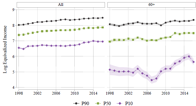 그런데, 2008-2016 사이에 지속되는 고령화에도 불구하고 불평등이 줄어드는 이유는 하위계층 노인 가구의 소득 상승 때문이다. 노인층을 제외하면 소득 패턴에 거의 변화가 없다. 아래 그래프에서 보듯이 60세 이상 고연령층 중 하위 10%p의 소득이 2008년 이후 크게 늘었다. 그 이유는 취로 사업 때문일 가능성이 매우 크다. 보수언론에서 매 번 비난하는 푼돈주는 노인알바 일자리다. 이 일자리는 글로벌 경제위기와 맞물린 MB 정권의 4대강, 재정확대에서 시작되었다는게 아이러니.