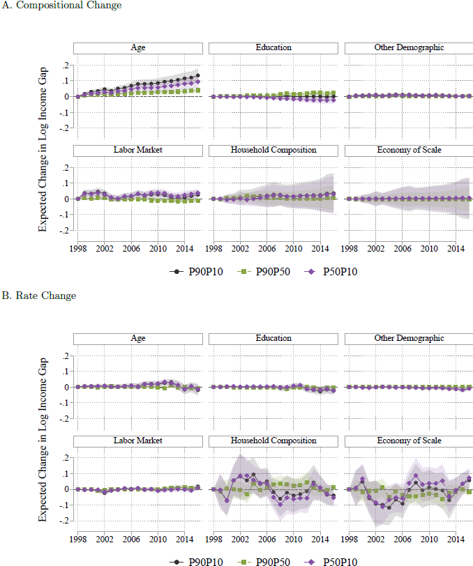 그 결과가 아래 그래프다. Compositional change라는건, 예를 들어, 세대 간 소득격차의 차이는 그대로인데, 고령화로 노인인구가 상승함에 따라 불평등이 얼마나 바뀌는가를 보는거고, Rate Change는 인구구조는 그대로인데, 세대 간 소득격차 변화가 불평등에 끼치는 정도가 얼마인지를 계산한거다.