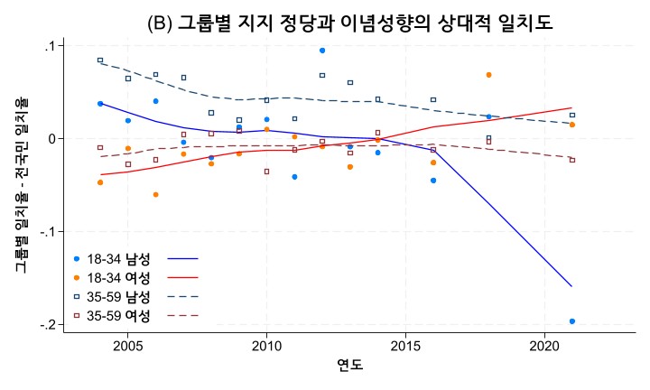 아래 그림(B)는 18-34세 남녀, 35-59세 남녀의 지지 정당과 이념성향의 상대적 일치도를 본 것이다. 여기서 상대적이라고 하는 이유는, 그룹별 일치도에서 전체 응답자의 일치도 변화를 뺀 것이기 때문이다. 위의 그림(A)에서 관찰된 지지정당-이념성향 일치도 상승이 모든 그룹에서 나타나면 그래프는 모든 수평(flat)의 직선을 보일 것이다.