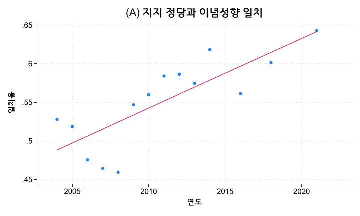 보다시피 지지 정당과 이념성향의 일치도는 꾸준히 늘었다. 21세기 초반에는 50% 정도였는데, 2021년 조사에서는 65%에 이른다. 전반적인 학력 상승, 지역 기반 정당 대결에서 정책 대결로의 전환으로 인한 자연스러운 현상이라고 생각된다.