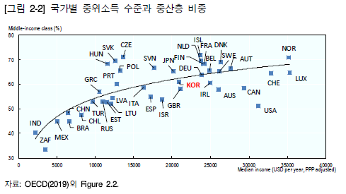 아래 그림도 보고서에 있는 건데, 한국의 중산층 인식 비중은 높지도 낮지도 않다. 소득의 측면에서 중산층이 61%인데, SSS의 중산층은 72%다. 객관적 중산층보다 주관적 중산층이 많은건, 대부분의 유럽 국가에서도 나타나는 특징이다. 한국적 특징이 아니다.