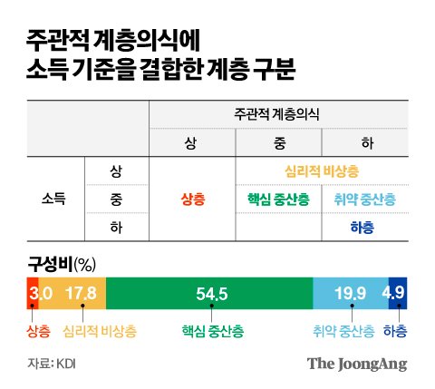 객관적으로는 상층인데 중산층으로 인식하는 계층을 "심리적 비상층"으로 분류했다. 소득 상층의 76%가 여기에 속한다. 소득, 교육, 직업, 자가보유 등 모든 측면에서 상층인데도 자신을 중산층으로 여기고, 정치적으로는 가장 진보적이다. 강남좌파의 위선을 드러내는 지표라고 생각할 것이다. 아니나 다를까, 중앙일보 칼럼은 나랏돈으로 이들을 지원하지 말고 취약 중산층 지원에 초점을 맞춰야 한다고 주장한다.