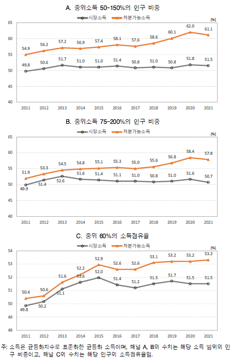 먼저 강조하고 싶은 점: 지금까지 중산층 위기론을 펼치던 분들은, 자신의 분석이 잘못되었다는걸 인정하시는게 좋지 않을까 싶다. 아래 그래프는 보고서 8쪽인데, 어떤 기준으로 봐도 한국의 중산층은 인구 비중과, 전체 소득에서 차지하는 비중이 모두 늘었다. 소비를 기준으로 측정해도 마찬가지다. 중산층이 줄어들기는 커녕 두터워졌다.