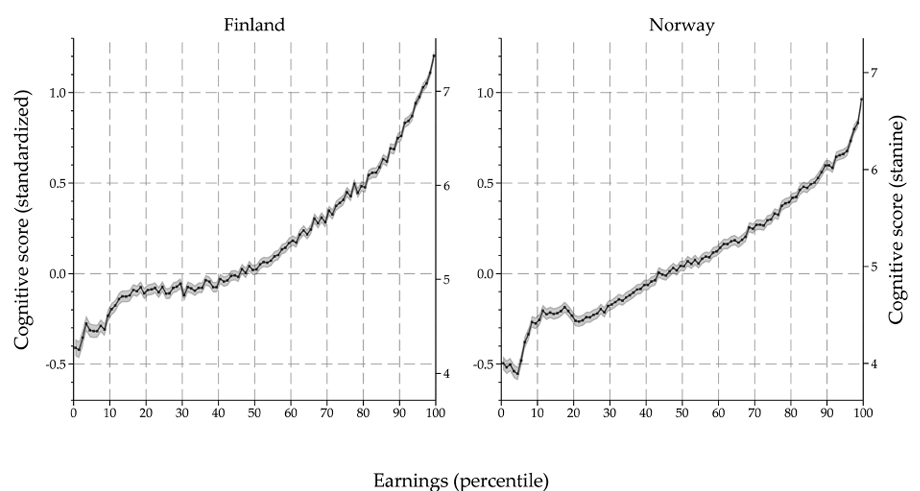 복잡한 분석 아니고, 핀란드와 노르웨이 군입대 당시의 인지능력 점수와 국세청에 보고된 35-45세의 소득을 매치해서 상관관계를 본거다. 결과는 아래와 같다. 보다시피 소득과 인지능력은 강한 정의 상관관계를 지니는데, 스웨덴 결과와 달리 최고 소득층위에서 상관관계가 없어지는게 아니라 오히려 더 강화되더라는 것.