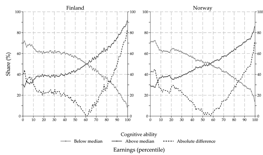 Ps. 저자들은 위 상관관계가 개인 소득을 예측하는 도구로써 가지는 한계에 대해 주의를 환기하며 글을 맺는다. 인지능력이 중간 이상인 사람들과 이하인 사람들이 각 소득층위에서 차지하는 비율은 아래와 같다. 예를 들면 상위 10% 지점에서 중간 이상의 비율은 약 3/4, 중간 이하의 비율은 약 1/4이다. 소득 최상위 1%에 인지능력 중간 이상인 사람이 차지하는 비중이 핀란드는 9%, 노르웨이는 14%라는거다.