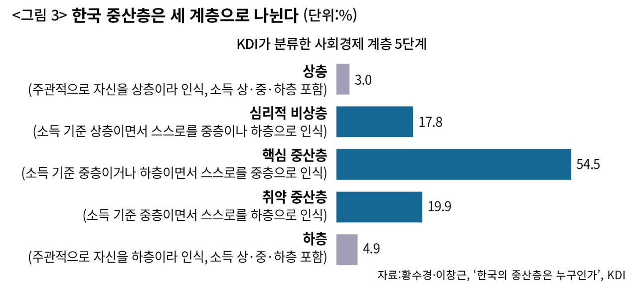 아래 그래프는 기사 중 일부이다. 그래프를 보면 하층은 "(주관적으로 자신을 하층이라 인식, 소득 상/중/하 포함)"이라고 기술하고 있다. 그래프에서만 이렇게 되어 있는게 아니고, 기사 중에서도 "여기에 객관적 소득 기준과 관계없이 스스로를 ‘상층’이라 인식한 집단과 ‘하층’이라 인식한 집단을 포함해 총 다섯 계층을 구분해 분석했다"고 기술하고 있다. 상층과 하층은 소득에 관계없이 주관적 인식으로 나누고, 중층만 소득과 관련해서 분류했다는 내용이다.