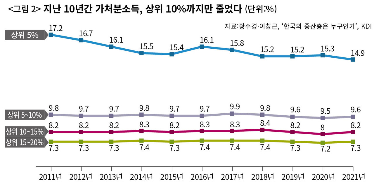 시사인 기사는 "최근 10년간 가처분소득이 가파르게 줄어든 집단이 있기는 하다. 소득 기준 상위 20%, 엄밀히 말하면 그중에서도 상위 10%에 해당하는 계층이다. 이들은 지난 10년간 세금과 사회보험료 부담이 늘어나 개인이 마음대로 쓸 수 있는 돈이 줄어들었다"라고 한다. 상위 10%의 소득이 줄었다는 거다. 그러면서 아래 그래프를 제시한다.