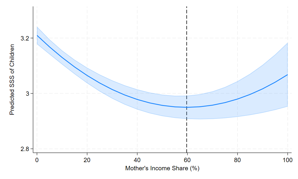 그런데 워킹맘 자녀들의 계층인식이 전업주부 자녀들의 계층인식과 어떻게 연계되어있는지 살펴봤더니, 아래 그래프처럼, 다른 조건이 동일할 때, 모친의 가정경제 기여도가 높아질수록 자녀의 계층인식은 저하되었다. 모친의 가정경제 기여도가 60%가 넘어가면 추세가 역전되는데, 이 경우는 60%가 넘어가는 표본수가 매우 작아서 통계적으로 유의하다고 할 수 없다.