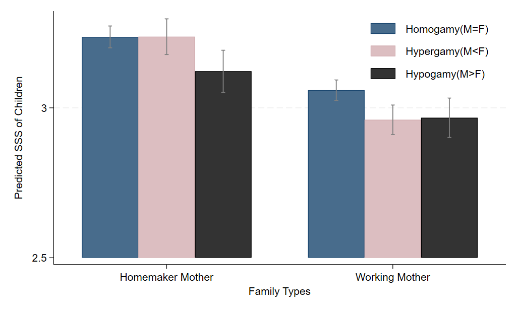 전업주부가 아니라 워킹맘인 경우에는 부모의 교육 결합 유형에 관계없이 자녀의 계층 인식이 낮다. 그 중에서 변화가 특히 큰 경우는, 부친의 교육수준이 모친보다 높은데, 모친이 일을 하는 경우다. 모친이 전업주부였을 때는 모친의 교육수준은 자녀의 계층인식에 영향을 끼치지 않았는데, 모친이 일을 하게 되면, 자녀의 계층 인식이 크게 낮아진다. 부부의 교육결합에서는 남편이 교육수준이 높은 전통적 양식을 따르지만, 경제 기여도에서는 부부 모두가 일해서 남성 부양자 모델에서 벗어나는 비전통적 양식을 따라서, 전통적 양식과 비전통적 양식이 결합할 경우, 교육과 경제기여도 모두에서 전통적 양식을 따르는 경우에 비해 자녀들의 계층인식이 크게 낮아지는거다.