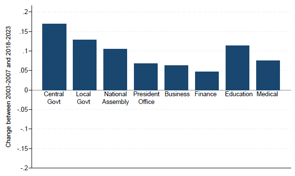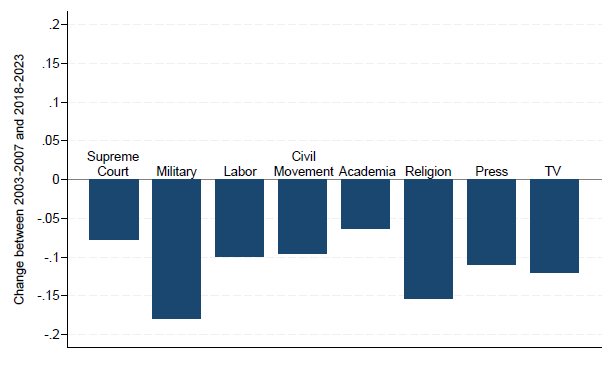 마지막으로 기관 신뢰도의 변화다. 아래 그래프는 KGSS를 이용해서 2003-07 대비 2018-23 기관별 지도자들의 신뢰도 변화다. 첫 번째 그래프는 신뢰도가 증가한 곳이고, 두 번째는 하락한 곳이다.