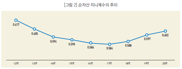 지금은 2017년 이후 (주택가격의 상승이 가장 큰 이유일텐데) 자산불평등이 7-8년간 증가하였다. 그렇다고 폭발적 증가인건 아니고 2013년 보다 살짝 높고, 2012년보다는 낮다. 그런데 이제는 한겨레21 기사에서도 얘기하듯 자산불평등이 계속 늘었고, 가금복 조사이후 (2012년을 제외하고) 최대치를 기록했단다. 자산불평등 증가 때문에 큰 일이라는 식이다.