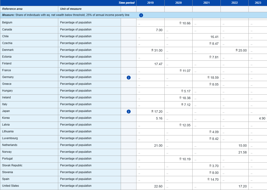 아래 표는 OECD 지표 중 하나로 순자산이 빈곤기준치의 25%에 미달하는 가구의 비율이다 (소스는 요기). 빈곤 기준치의 25%라는 의미는 자산을 처분하면 3개월은 빈곤으로 떨어지지 않고 버틸 수 있는 자산 버퍼가 있다는 거다. 그에 미달한다는건, 소득이 없으면 자산을 모두 처분해도 3개월 내에 빈곤선 이하로 떨어진다는 것. 한국은 구사회주의권 국가 몇 개를 제외하고, 이 비율이 가장 낮다. 뿐만 아니라 2019년에서 2023년 사이에 그 비율이 더 낮아졌다.